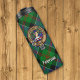 Clan Paterson crest badge surrounded by a strap and buckle over tartan background. Custom text.