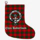 Christmas stocking features Scottish Clan Robertson tartan plaid background with clan crest badge and text overlay. Text can be customized to reflect your Robertson family member