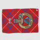 Clan Rose crest badge surrounded by a strap and buckle over tartan background. Custom text.