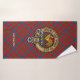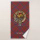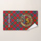 Clan Sinclair crest badge surrounded by a strap and buckle over red tartan background. Custom text on each towel.