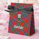 Clan Sinclair crest badge surrounded by a strap and buckle over red tartan. Custom text and monogram.