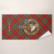 Clan Stewart crest badge surrounded by a strap and buckle over Royal tartan background. Custom text on each towel.