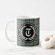 Coffee mug with the hunting tartan for Clan Thompson, a traditional Scottish plaid pattern in shades of light blue, brown and black, with bright green accents. Vintage pattern from 1958. Features your monogram initial in an Old English font and a round black badge with laurels on both sides of mug.