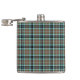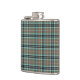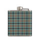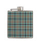 Flask with a light brown, blue, black, and green Scottish tartan. Traditional Clan Thompson family hunting plaid pattern from 1958.