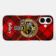 Clan Wallace crest badge surrounded by a strap and buckle over tartan background. Custom text.