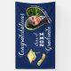 Create a unique blue, white and gold graduation banner for the class of 2025 graduate with a heart-shaped photo, Congratulations saying, and grad's cap and diploma illustrations. Please personalise with the graduate's name and surname, upload a custom photo via template, and change a year before ordering. You can also change the background colour inside the design tool to match your school colours.
