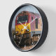 This round clock with a black surround features a photo of a vintage class 67 diesel locomotive, number 67022. Originally commissioned to pull high speed mail trains, the 67 class engines now mainly haul charter trains. The clock has white numbers and hands.
