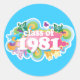 Did you graduate in the Class of 1981? It's time to show some class pride with this beautiful retro style 1981 graduate logo featuring swirls and stars in pink, green, blue and purple. Great for a 1981 class reunion or grab a reunion gift or 1981 stocking stuffer for a friend who graduated with you way back when.