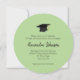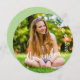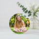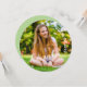 This round graduation party invitation features a custom photo frame that fills the entire front of this round invitation. Curved text, on the right side, reads: Class of 2019. The back offers a graphic of a mortarboard and custom text for the graduation party invitation details.