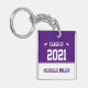 This royal purple and white keychain says 'Class of 2021' and has purple display text for the graduate's name. Two white graduate's caps are near the words 'Class of'.