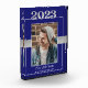 A blue and silver Class of 2023 graduation photo keepsake that you can personalise as a memento for the twenty, twenty-three graduate. The front is a classic blue with a fine white line surrounding the portrait of the graduating student. You can easily replace the sample photo with your own using the template area.