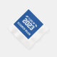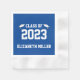 These deep blue and white graduation paper napkins say 'Class of 2023' in large white text. (You can change the year if necessary.) At the bottom, there's white display text you can change to show the correct name for the graduate. White graduate's caps are on either side of the phrase "Class Of".