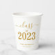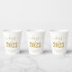 Stylish elegant custom graduation party supply! Celebrate the graduate's accomplishment in style with this trendy graduation party paper cups. Design features "Class of 2023" in gold font on a clean white background. Personalise this product by adding the name and school name. Easy to customise. Matching graduation party supplies available. Congratulations!