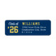 Graduation return address label features sporty class year text and custom wording that can be personalized with a last name and return address. The navy blue background color, and gold & white text colors can be customized to coordinate with any school color.