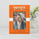 This orange & black Class of 2023 graduation invitation can be customised to invite to commencement exercises and/or a graduation party in honour of the graduate. This would work well for male or female graduates. The front features a portrait of the graduating student prominently placed with the 'class of 2023' above the photograph and the grad's name beneath. There is also a faux ribbon across the middle behind the picture. The back contains all the information required to attend the festivities. A black line and the 'class of 2023' are along the bottom edge. This invitation would work well for high school and college/university graduations.