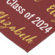 The table runnner is dark red. It has a text pattern for the graduate's name and Class of 2024. The name (Shown: Elizabeth) appears in an elegant faux (not foil) gold script. The other text is white. All of the text can be edited.