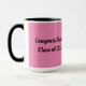 Combo mug in black, white and pink, features a clip art picture of a female graduate, with the message, "Congratulations Class of 2025". A great gift for the gal graduate! You can personalise the text and year, microwave and dishwasher safe too!