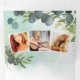 A 2 in 1 botanical greenery graduation tri-fold invitation featuring a rustic faded watercolor washed out backdrop, elegant blue eucalyptus leaves, splashes of faux gold foil, photos of the graduate, graduation party invitation, and an rsvp postcard for your guests to cut off and send back.
