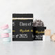 This graduation wrapping paper is black. The elegant wrapping paper has a text pattern for the graduate's first and last name and Class of 2025. The name (Shown: Elizabeth Anderson) appears in an elegant faux (not foil) gold script. The other text is white. All of the text can be edited.