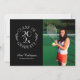 Send chic graduation announcements featuring 2 grad photos. On the front, your photo is on the right and a white on black typography emblem which reads: CLASS OF [YEAR] GRADUATE is on the left with your graduate's name and school below it in white on a black background. The words curve around the year in the middle with curved botanical leaves along each side of the circular design. A second photo fills the whole back of the card.