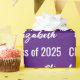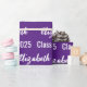 The wrapping paper is royal purple. It has a text pattern for the graduate's name and Class of 2025. The name (Shown: Elizabeth) appears in an elegant white script. The other text is also white. All of the text can be edited.