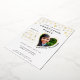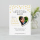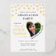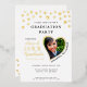 Create unique white and gold photo graduation invitations for the class of 2025 graduate decorated with golden hearts. Real gold foil is on the front side of the cards. Templates make it easy to personalise the invites with your data and upload a photo. Name and Family Name should be changed separately to have this stylish curved view. Please use the template to upload your photo to have the same heart-shaped image of the graduate. Try a few photos to choose which one suits best for a heart-shaped image.