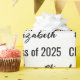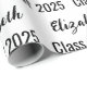 This graduation wrapping paper is white. It has a text pattern for the graduate's name and Class of 2025. The name (Shown: Elizabeth) appears in an elegant black script. The other text is also black. All of the text can be edited.