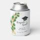 Create a unique can cooler for a graduation party with the design that features a Congrats Grad saying, and is decorated with a graduate's cap and elegant emerald green and gold eucalyptus greenery on a white background. The template makes it easy to type the graduate's name and year.