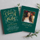 Stylish two-sided graduation announcement card and party invitation features an elegant faux gold foil design in script with pretty scroll accents. Front of the card also includes custom gold and white coloured text that can be personalised for the event. The back of the card announces the graduation with a photo of the graduate, their name, class year, and school. The emerald green background colour can be modified. Photo tip: crop your second photo to a square format before uploading to the site.