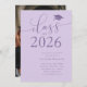 Elegant and simple graduation party invitation template for high school or college graduates! The typography text against the purple background says "Class of 2025" in modern script font. Customise this product by adding the graduate's name, school, and party information.