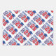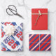 This image showcases a set of three wrapping paper sheets designed for celebrating the graduation of the Class of 2025. The top sheet features a repeating pattern of the text "SENIOR Class of 25" in bold red and blue letters, accompanied by blue graduation caps and diplomas on a white background. The middle sheet is a solid red colour, providing a vibrant and bold option. The bottom sheet displays diagonal stripes in red, white, and blue, creating a dynamic and festive look. This set is perfect for wrapping gifts for graduates, adding a celebratory touch to any present.