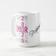 This personalised mug design features the word "SENIOR" repeated multiple times in a bold, black outline font. The numbers "2" and "5" are interspersed within the word "SENIOR" in a vibrant, glittery pink colour. The central "SENIOR" is filled with the same glittery pink pattern, and the phrase "class of" is elegantly scripted across it in white. This design celebrates the graduating class of 2025 with a stylish and eye-catching look, perfect for commemorating this special milestone.