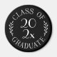 Chic white on black typography emblem reads: CLASS OF [YEAR] GRADUATE with the words curving around the year in the middle with curved botanical leaves along each side of the circular design. Customize the year in the sidebar. Makes a fun graduation gift.