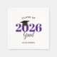 Use this personalised graduation napkin at your grad party celebration! The modern purple and black design offers custom text for the name of the graduate. The text reads: Class of 2026 Grad. The design is accented with a black graduation hat.