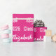 The wrapping paper is hot pink. It has a text pattern for the graduate's name and Class of 2026. The name (Shown: Elizabeth) appears in an elegant white script. The other text is also white. All of the text can be edited.