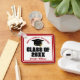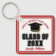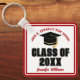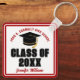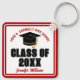 This modern red and white custom Class of 2026 graduate keychain features your high school or college name. Customise with your graduating student name under the cool script and black grad cap for a great personalised graduation key chain gift.