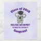 A wine bottle label which says Congrats Class of 20xx, customise with the year of graduation, a personal name and school. Designed with a light purple background. Illustrated with a cute koala bear with a black graduation cap eating some eucalyptus leaves.