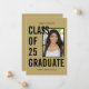 Your graduate's photo, surrounded by large bold lettering "CLASS OF 25 GRADUATE", finished with your name and high school. On the back, you can share a story or the graduate's bio of interests and activities, or delete the text and leave blank. Add your own photo and other details by following the "Personalise" link. The black and gold colours can also be changed, to match your graduate's school colours, by using the edit menu. If you would like assistance, please feel free to reach out to me via email at susanmingaydesigns@gmail.com
