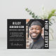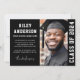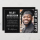 Modern graduation photo announcement card featuring your photo and the graduate's name in a modern college sports style font. Whte text on black background. Colours and fonts are customisable in the design tool.