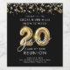Personalised and custom festive wine or beverage container labels for a 20 Year Class Reunion to use as table decorations and/or commemorative keepsake favours. The design features faux metallic gold balloon number typography, gold streamers and confetti and white lights in your choice of background colour (shown in black) you can change in EDIT to coordinate with your school colours or party theme colours. ASSISTANCE:  For help with design modification or personalisation, other balloon numbers for another year, transferring the design to another product or if you would like coordinating items, contact the designer BEFORE ORDERING via the Zazzle Chat MESSAGE tab or email makeitaboutyoustore@gmail.com.