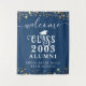 Welcome alumni to their high school or college class reunion (editable for any year reunion) with this custom colour tapestry to be used as a sign or photo op backdrop featuring gold stars, string lights, calligraphy script and decorative typography and personalised with your school name and graduating class year. The colours (shown in blue, gold and white) can be changed to your school colours or coordinating party theme colours in EDIT. TAPESTRY OPTIONS: The sample is shown in the 50x60" size--other sizes are available on the ordering page. ASSISTANCE: For help with design modification or personalisation, colour change, resizing or transferring the design to another product, contact the designer BEFORE ORDERING via the Zazzle Chat MESSAGE tab below or email makeitaboutyoustore@gmail.com.