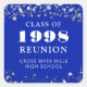 Personalised royal blue high school or college class reunion square stickers or envelope seals for any graduating class (the year is editable) with your class year and school name. The design features silver stars and string lights in your choice of colours (shown in royal blue and silver) you can change to your school colours or coordinating party theme colours. ASSISTANCE: For help with design modification or personalisation, colour change, resizing, transferring the design to another product or you would like coordinating items, contact the designer BEFORE ORDERING via the Zazzle Chat MESSAGE tab below or email makeitaboutyoustore@gmail.com.