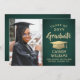 Announce a high school or college graduation and invite family and friends to celebrate with custom photo green and gold party invitations. The picture and wording are simple to personalise and the colours are easy to change with the Zazzle design tool. This downloadable template is set up as a combination announcement card and party invitation that can be customised with any details of your choice, such as parents' names, special honours, degree title, favourite inspirational quote, graduate's future plans or new address. The design features a dark green ombre background, faux foil mortar board cap, elegant modern calligraphy, classic vintage typography and one favourite photo, such as a senior picture or an image from the commencement ceremony. Please note that gold is printed colour, not metallic foil. This printable graduation card is a stylish way to announce a special day celebration. Congratulations to the graduate!
