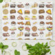 Design features an original marker illustration of a row of classic American "greasy spoon" diner foods, including eggs, hash browns, onion rings, pie, coffee, ice cream, burger, waffles, club sandwich, grilled cheese, pancakes, and more. Ideal for your favourite foodie or fan of classic rail car diners.