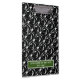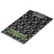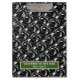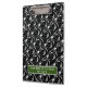 Behold this design's captivating allure, set against a classic black and white backdrop. It proudly showcases an intricate floral pattern that defies convention. Instead of real flowers, it embraces a vintage seamless vector motif meticulously printed on both sides of the clipboard in white. This classic black background complements and contrasts elegantly with the alabaster floral design. Positioned slightly below the centre on the front side, a rectangular banner in dark green, primed for your personal touch, awaits. With its slim border and matching text colour, it's the perfect canvas for your name, company name, or a brief message in the second line.
