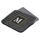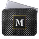 A large white monogram is a on black square with a faux gold border. White polka dots are on this black laptop sleeve.