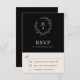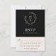A tasteful and classic choice in wedding response cards, this design conveys a simple elegance in its text layout and classic style. A simple open laurel wreath of sketched leaves surrounds the monogram initial of the bride and groom. The elegant yet simple text template is ready to personalise with your initials and required RSVP date This response card is a versatile choice for weddings at any season of the year and for any wedding venue, whether a solemn religious ceremony or a secular type affair at a banquet hall, winery, museum, restaurant, private club, or a rustic wedding outside in nature. It is available in a variety of popular colours (shown here in classic black and ecru) as well as many different paper types and weights.
