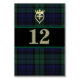 Lovely Scottish tartan plaid wedding table number card, done in the universal dark blue, green, and black of the Black Watch. A green edged black band, across the middle, has bold numbers ready to personalise for each table at your wedding reception. Gold tone graphics of a Luckenbooth love symbol decorates the top of the table card. Matching wedding products are available for your Highland wedding.
