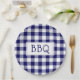 Get ready for your summer barbecue party with paper plates featuring dark blue, white, and light blue squares in a classic buffalo plaid with the letters BBQ in a white rectangle in the centre.