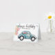 This whimsical Birthday Day card features a blue watercolor classic bug car loaded with gifts on the inside and balloons tied to the back bumper. Above the car it reads "Happy birthday" in a fun hand-lettered font. There is a place for personalising with a name. You can also add the birthday boy/girl's age/year on the door of the car. The inside features a red car (you can add the year on this car too).